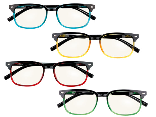 Occhiali 4 colori (Nero/Blu - Nero/Giallo - Nero/Rosso - Nero/Verde). 6 diottrie: 1/1,5/2/2,5/3/3,5. Lenti Real Blue Block per la protezione dai nocivi raggi blu di PC, tablet e smartphone, cerniera con meccanismo flessibile a molla.. Diottria +3 - Conf. 4 pezzi (1 pz. per colore)