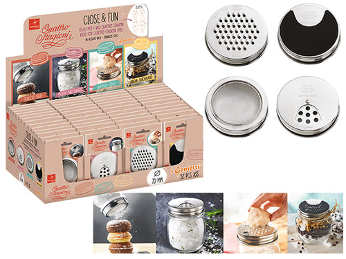 Epositore da banco contenente 52 pezzi - 4 referenze: Tappo grattugia - Tappo lavagna - Tappo sale e spezie - Tappo setaccio. Tappi adatti a vasi vetro da 250 ml. e 500 ml. con Imbocco à 70 mm. (ns. cod. 013582 - 013584).