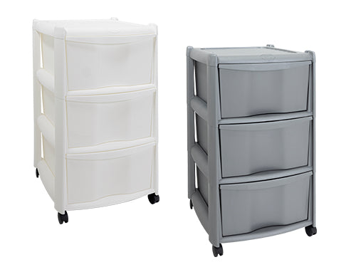 In polipropilene, 3 cassetti, 4 ruote. Dimensioni 39x39xH60 cm.. Bianca