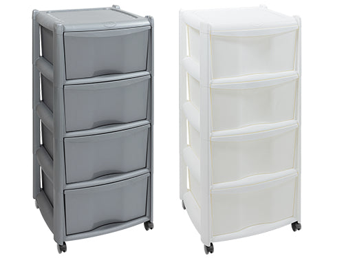 In polipropilene, 4 cassetti, 4 ruote. Dimensioni 40x40xH85 cm.. Bianca
