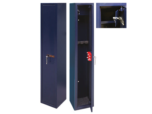 Serratura doppia mappa, 2 catenacci à 22, predisposizione per ancoraggio a parete ed a pavimento, appoggio calcio antiscivolo, rastrelliera in polietilene. Dimensioni L24 x P24 x H143 cm. Peso Kg. 21,5 .