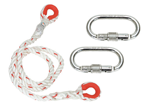 Elemento di ancoraggio lunghezza mt. 1,5. In poliammide a tre fili con indicatore di usura, à 14 mm., 2 moschettoni 30, carico di rottura 3300 Kg. Norma EN 354:2010 Durata di vita è di 10 anni dalla data di fabbricazione e di 5 anni dal primo utilizzo..