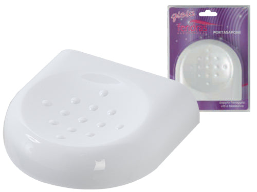 Portasapone in ABS bianco con doppio fissaggio tasselli o biadesivo.
