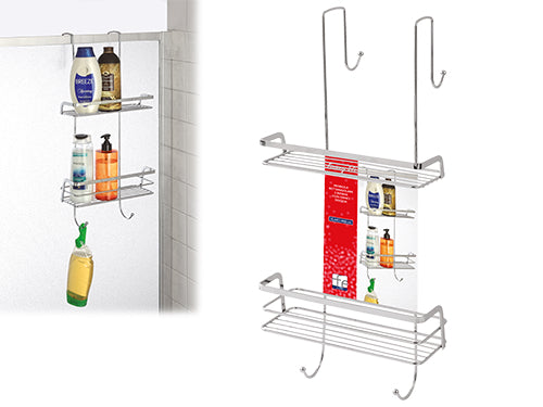 Mensola rettangolare a 2 ripiani in acciaio cromato con gancio parete doccia. Dimensioni 25x11xH60 cm..
