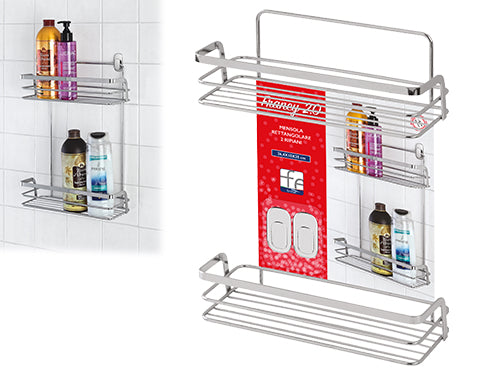 Mensola rettangolare a 2 ripiani in acciaio cromato. Dimensioni 26x10xH35 cm..