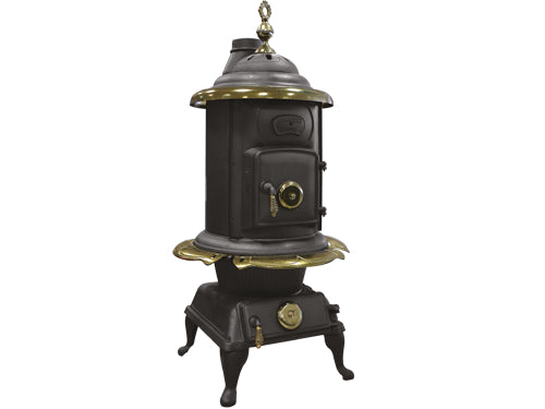 Interamente in ghisa nera con particolari ottonati, potenza termica 10 Kw, raccordo uscita fumi superiore Ã120 mm., peso 80 kg. Dimensioni 61x54xH131 cm..