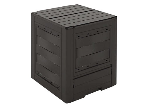 Compostiera in materiale plastico riciclabile 60x60xH73 cm., capacità 260 lt., portello di carico superiore, sportello di scarico. Colore nero Il compostaggio sfruttando i processi naturali della decomposizione dei materiali organici permette di ottenere un terriccio ricco di humus.
