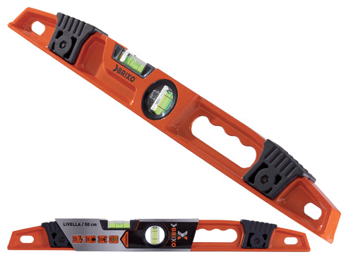 In alluminio pressofuso verniciato a polvere epossidica, 1 fiala orizzontale, 1 fiala verticale, antiurto, resistente ai raggi UV, gommini protezione martello, maniglia ergonomica. Lunghezza 50 cm.
