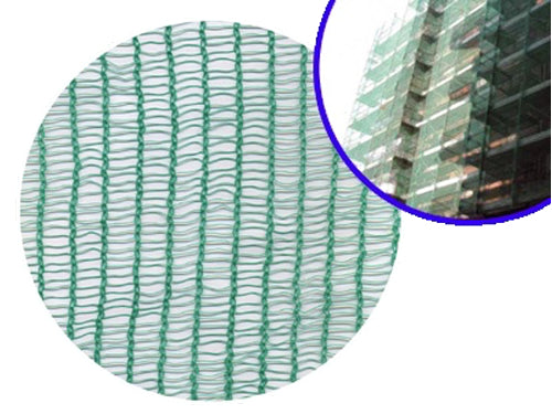 Rete per ponteggi schermante in HDPE monofilo - 50gr/mq, stabilizzata ai raggi UV, cimosa 4,5 cm., occhielli metallici sui bordi ogni 90 cm., colore verde. Dimensioni: H1,8x25 mt. (45 mq) .