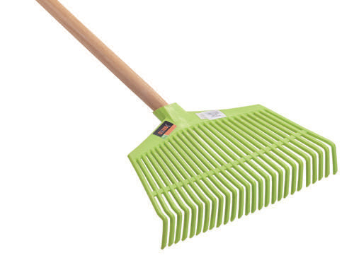 Scopa per foglie e nocciole, rettangolare, larghezza 39 cm. - gr. 200, i denti arrotondati rispettano i prati non strappando le radici dell'erba, con manico in legno di faggio cerato H 140 cm. - Ã 26.