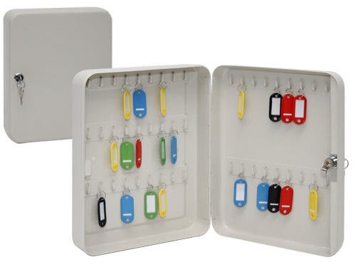 In lamiera pesante verniciata a forno, finitura a buccia dâarancia, con cilindro di sicurezza a chiusura a gancio sul frontale . 20 posti: 20x16x7 cm.