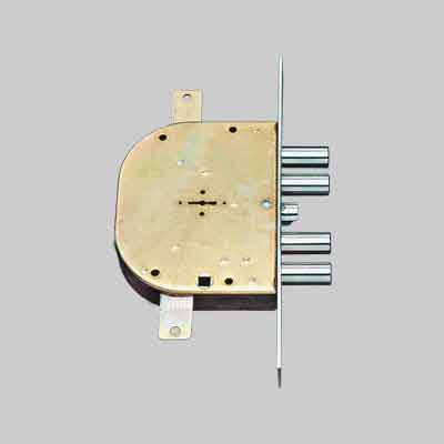 Doppia mappa, chiusura triplice, scrocco reversibile comandato dalla chiave e dal quadro maniglia. 4 catenacci, corsa mm.38. Scatola zincata mm.164x130x32. In dotazione n° 3 chiavi fisse mm.92 e 1 da cantiere. Ad infilare.