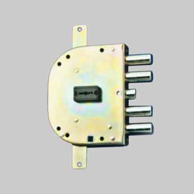 Doppia mappa, chiusura triplice, scrocco comandato dalla chiave e dal quadro maniglia. 4 catenacci, corsa mm.38. Scatola zincata mm.164x130x32. In dotazione n° 3 chiavi fisse mm.116 e 1 da cantiere. A planare.