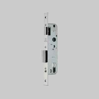 Scrocco reversibile, catenaccio a 1 mandata e quadro maniglia mm.8. Foro per cilindro profilato. Interasse maniglia/cilindro mm.85. Frontale in acciaio inox mm.22.