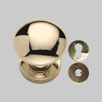 In ottone. Impugnatura Ø 54 mm, rosetta Ø 45 mm. Completo di rosetta e bocchetta con foro Yale.