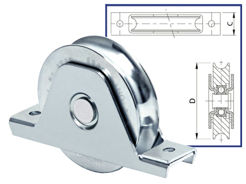 In acciaio zincato, con supporto interno gola semitonda con 1 cuscinetto . Ã 120 mm. - L. supporto 37 mm. - Portata kg. 220