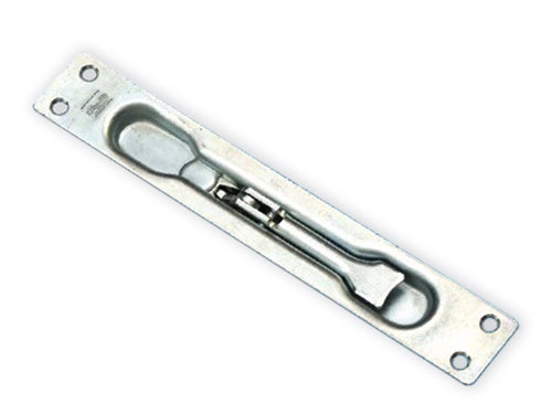 Catenaccio ad incasso leva zincata, in acciaio zincato, con una mandata filettata per aste à 8 mm., corsa 16 mm., frontale 24 mm., altezza 160 mm., completo di viti per il montaggio .