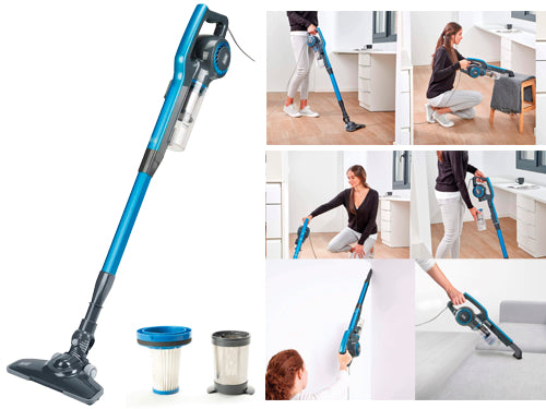 Potenza 600 Watt, capacità 800 ml., senza sacco. Sistema di filtraggio ad alta efficienza in 3 fasi, per catturare anche le particelle più piccole. Sistema ciclonico + prefiltro in acciaio inossidabile microperforato + filtro EPA. Spazzola con snodo, si adatta a qualsiasi tipo di superficie, tubo di estensione in alluminio, cavo 6 mt..
