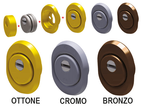 Kit completo protezione cilindro Ã50 mm.: Cover e Piastrina antistrappo. Interasse 38 mm. In carbonitrurato>60HRC resistente al trapano. (La carbonitrurazione è un processo di carbocementazione austenitica simile alla cementazione). 4251E F4 Bronzo - Ã50xH15 - Spess. 8 mm.