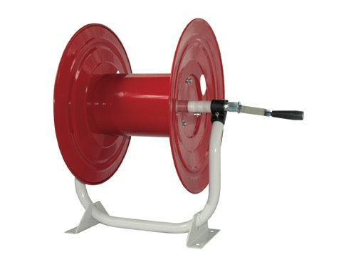 Avvolgitubo professionale in acciaio verniciato a polveri epossidiche, con base a staffa, per 100 mt. di tubo alta pressione 20 bar, albero di distribuzione acqua e maniglia completamente in metallo zincato, raccordo girevole in ottone da 8 mm., in entrata e portagomma in ottone per tubo 8/10 in uscita.