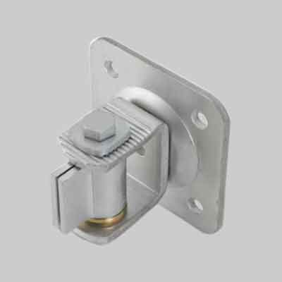 In acciaia zincato. Regolabile con piastra a fissare e cerniera con cuscinetto e ala a saldare.