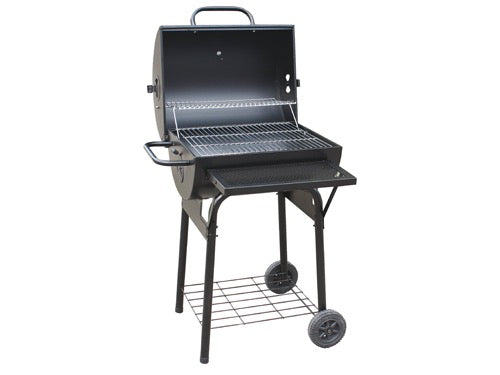 Modello a carbone, 1 griglia composta da due pezzi ognuno 23.5x43,5 cm. (tot. 47x43,5 cm.) + 1 griglia articolata 48x24 cm., coperchio con termostato, coperchio e braciere con prese aria regolabili laterali, piano appoggio anteriore e piano inferiore, maniglia laterale. Dimensioni 63x68xH100 cm..