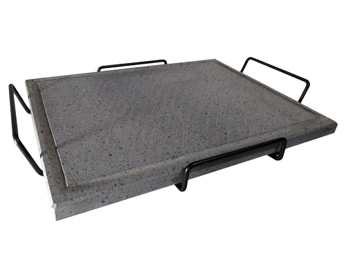 Pietra lavica a bistecchiera con scanalatura perimetrale per raccolta grassi. Struttura portante in ferro tondo Ã6 mm. verniciato nero, impugnature laterali. Dimensioni 40x30 cm..
