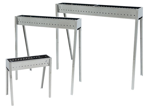In acciaio inox Aisi 430 BA (lucido) con sistema mono-parete con profili antitaglio (Grazie al sistema di mono-parete e al doppio fondo il prodotto mantiene una buona circolazione dell'aria sotto la brace). Montaggio/Smontaggio delle gambe con sistema di innesto a baionetta. Togliendo le gambe può essere utilizzato sopra a strutture di pietra esterne o interne, tipo il camino. Milano 80: 78,5x32,5xH79,5 cm. - Braciere 11x78,5 cm.