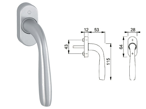 In alluminio finitura cromo satinato. Scatto 45° - Perno à 10 mm. - Misura quadro 7 mm. - sporgenza del quadro 35 mm..