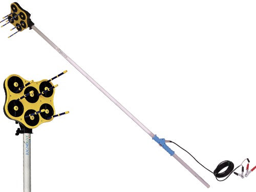 Funzionamento a batteria 12 Volt (Batteria non in dotazione), testina orientabile, asta in alluminio 2 mt. + prolunga 60 cm., impugnatuta anatomica con pulsante accensione, cavo elettrico 10,5 mt., con spinotto ad attacco rapido. Sistema a tripla azione: rotatoria - oscillante - percussione. Testa con 6 aste con boccole rotanti montate su 6 testine rotanti ARR (Astine Rulli Rotanti).