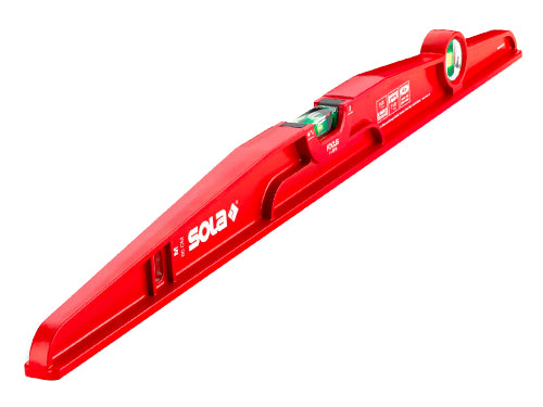Profilo in alluminio pressofuso, trapezoidale, con superficie di misurazione fresata 1 fiala orizzontale, 1 fiala a piombo; fiale controllate elettronicamente. Migliore leggibilità in caso di scarsa luminosità grazie ad un rivestimento fluorescente. Fiala a blocco in vetro acrilico infrangibile con lente di ingrandimento (+20 %) Tolleranze di misurazione precisione max: in posizione standard normale 0,5mm/m - in posizione capovolta 1,0 mm/mt.. Lunghezza 40 cm.