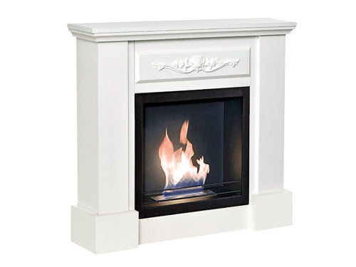 Struttura con mantello in legno MDF verniciato di bianco, un inserto in acciaio e un bruciatore certificato dotato di spegnifiamma e lana di roccia interna. Combustibile bioetanolo. Potenza termica 2,5 kW/h, capienza bruciatore 1,5 Lt., consumo 0,30 Lt./h, volume riscaldabile 40 mc., durata combustione 5h ca. Dimensione L81xP29xH76 cm..