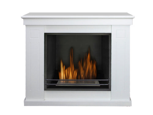 Struttura con mantello in legno MDF verniciato di bianco, un inserto in acciaio e un bruciatore certificato. Combustibile bioetanolo. Potenza termica 3 kW/h, capienza bruciatore 1,7 Lt., consumo 0,30 Lt./h, volume riscaldabile 56 mc., durata combustione 5h30 ca. Dimensione L98xP32xH83 cm..