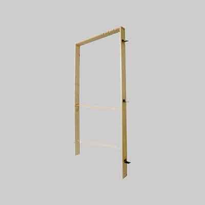 In legno di abete spessore cm.2. Incastro a 'coda di rondine', completo di n° 6 zanche metalliche premontate. Per porte interne di larghezza da 74 a 104 cm.
