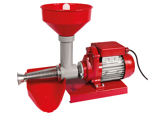 Potenza 400 Watt - n°3. Produzione 100 Kg/H. Funzionamento continuo. Cono filtro in acciaio inox 18/10 (AISI 304, corpo ed elica passapomodoro in resina acetalica conforme al contatto con gli alimenti e ad alta resistenza, imbuto e sgocciolatoio in materiale plastico per alimenti.
