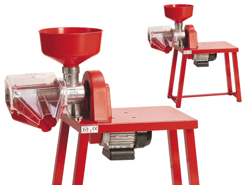 Corpo macchina e ghiera in alluminio UNI50 pressofuso brillantato per alimenti, trasportatore a vite in poliammide, albero in acciaio, filtro in ferro stagnato, gocciolatoio in polipropilene copolimero per alimenti, imbuto in polipropilene alta densità , pestello in polietilene alta densità , tavolo da lavoro in acciaio verniciato. Motore asincrono monofase 330 Watt - 230 V 50 Hz 40 poli 0,5 Hp..