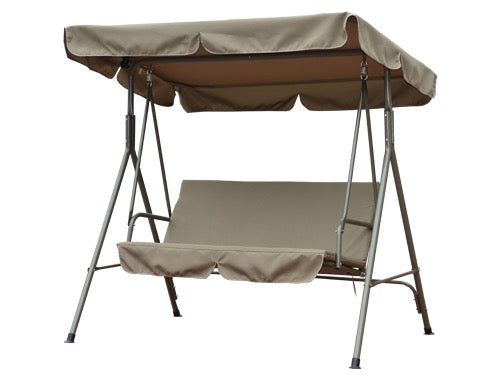 Dondolo 3 posti, struttura in acciaio verniciato colore grigio, parasole orientabile in poliestere 160 gr/mq. colore tortora chiaro, rivestimento/cuscini in poliestere Oxford 600x300D colore tortora chiaro. Tubi portanti Ã38 mm., tubi di collegamento Ã25/16 mm. Dimensioni L170xP110xH152 cm. Capacità max 300 Kg..