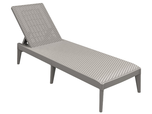 Struttura in resina effetto rattan resistente agli agenti atmosferici. Dimensioni 186x60xH29 cm., schienale regolabile. Colore grigio.