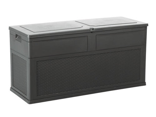 Struttura in resina inalterabile, resistente al gelo e alle intemperie ed ai raggi UV, maniglie per un comodo trasporto, lucchettabile, facile montaggio ad incastro. Particolari in finitura effetto rattan. Dimensioni L119xP46xH60 cm. - Lt. 320. Colore antracite.