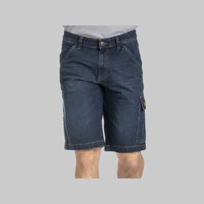 Bermuda da lavoro in denim leggero stretch Fibreflex con tascone laterale e tasca metro. Tessuto: 83% Cotone, 15% Poliestere, 2% Elastan. Peso: 288g/m². Vita alta, cintura con elastico antiscivolo, tasca per cellulare.