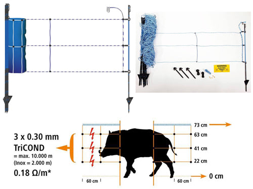 Rete per cinghiali: Altezza utile 73 cm.; Altezza totale 90 cm. - rotolo 50 mt con 12 paletti staccabili, conduzione con 3 fili conduttori in acciaio, punta zincata sul paletto di plastica, il primo filo da terra è nullo.