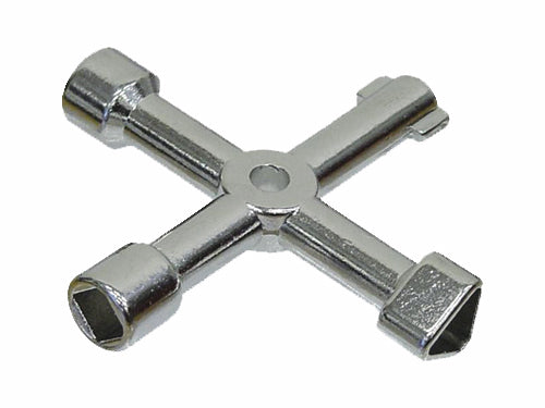 Chiave universale multiuso a 4 profili. Idonea per l'apertura di cassette per contatori gas e acqua, pannelli di comandi elettrici, manichette antincendio, cancelli automatici, torni per officina, compressori.