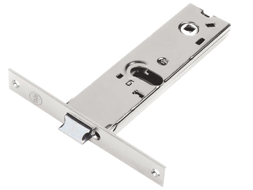 Per porte in alluminio con fascia stretta. Scrocco reversibile e catanaccio incorporato, frontale in acciaio inox, cassa in acciaio zincato, scrocco nichelato, quadro 8. Entrata 58 mm. - Frontale 22 - Interasse 48 - 1 Mandata