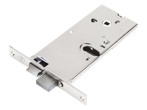 Per porte in alluminio con fascia alta. Scrocco e catenaccio, scrocco reversibile, rullo regolabile, scrocco e catenaccio nichelati, frontale in acciaio inox, cassa in acciaio zincato, foro per cilindro ovale, quadro 8. Entrata 80 mm. - Frontale 22 - Interasse 67 - 3 Mandate