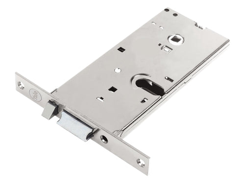 Per porte in alluminio con fascia alta. Scrocco e pistone di ricarica reversibile, scrocco e catenaccio, frontale in acciaio inox, cassa in acciaio zincato, scrocco e catenaccio nichelati, foro per cilindro ovale, quadro 8. Entrata 80 mm. - Frontale 16 - Interasse 67 - 3 mandate