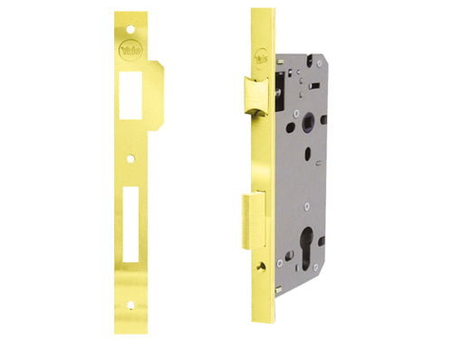 In ottone lucido, scrocco e catenaccio, scrocco reversibile, frontale in acciaio, cassa verniciata, contropiastra bordo quadro, con aletta inclusa, interasse 85 mm. Certificata EN 12209:2003. Entrata 45 mm.