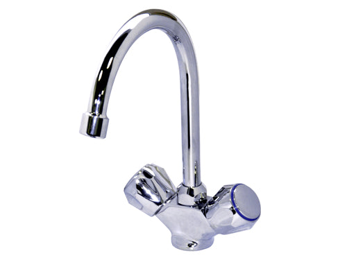 Gruppo lavello monoforo canna curva a snodo, serie in lega di ottone, manopole globo.
