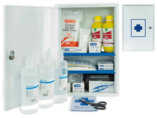 Armadietto in metallo 30x14xH46 cm. verniciato con polvere epossidica. Serratura con chiave. Dotato di 2 ripiani in plastica. Contenuto 20 referenze per prime operazioni di soccorso Per aziende del gruppo AB con più di tre lavoratori. Per il contenuto consultare la scheda tecnica.