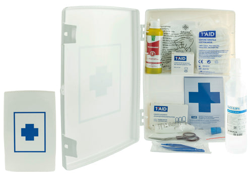 Armadietto in plastica 24,5x13xH35 cm. Dotato di 1 ripiano e fori posteriori per lâattacco a parete. Contenuto 16 referenze per prime operazioni di soccorso. Per aziende del gruppo C con meno di tre lavoratori. Per il contenuto consultare la scheda tecnica.