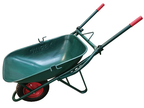 Telaio tubolare con stanghe ribaltabili e gancio per sollevamento, vasca in acciaio con bordo rinforzato a norme antinfortunistica (D.P.R. 27/4/55 n° 547), verniciatura a forno, capacità 70 Lt., (portata max 132 Kg.) con ruota pneumatica 350x80, mozzo 190 mm..